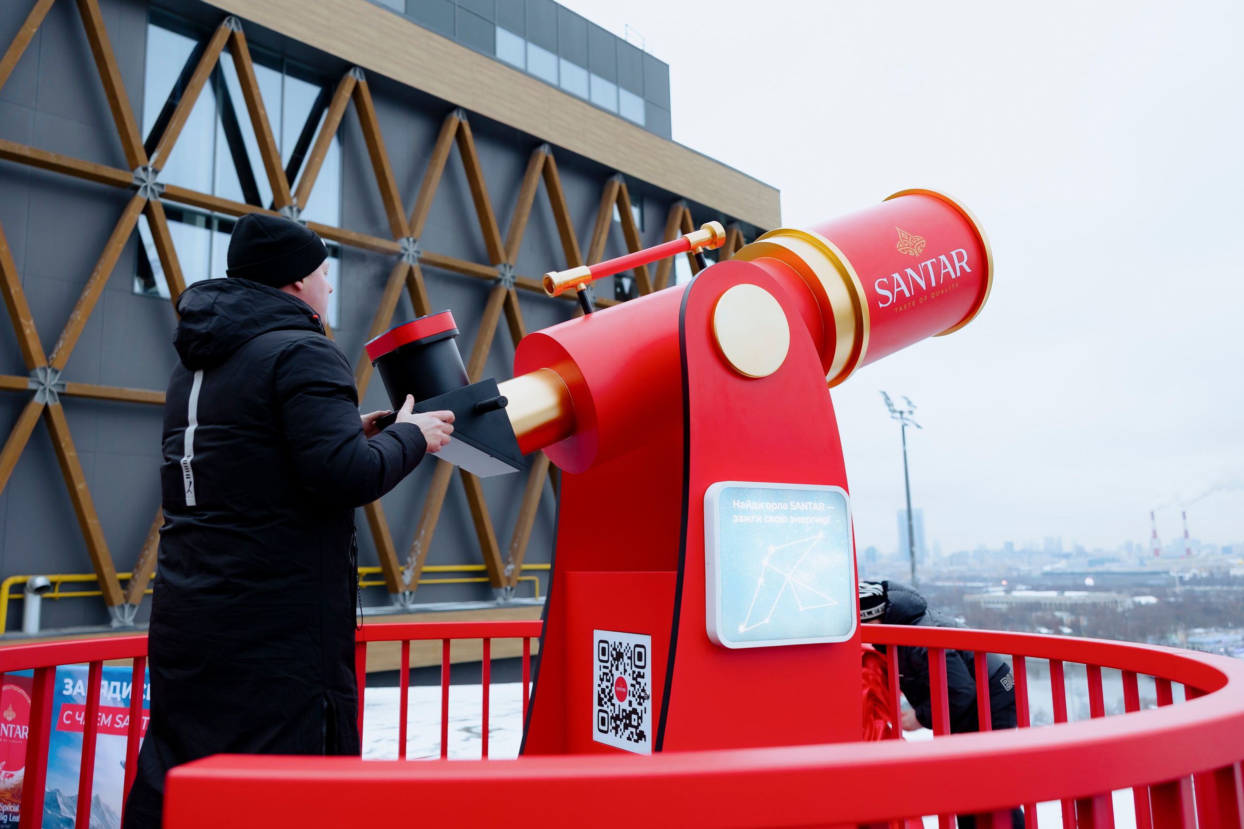 Яркая крупная пачка чая SANTAR Special Big Leaf стала частью композиции: она привлекает внимание и усиливает связь с брендом.На корпусе телескопа размещён QR-код, через который продолжается взаимодействие с брендом. Перейдя по нему, посетители попадают на специальную страницу проекта: здесь можно узнать больше о SANTAR, принять участие в конкурсе и стать участником розыгрыша чайных наборов. Это позволяет продлить впечатление от инсталляции и сделать знакомство с брендом более интерактивным и увлекательным